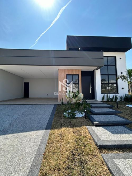 Casa térrea com arquitetura moderna e acabamentos de primeira linha, iniciando pela fachada com pé direito alto, piso fulget, janelas com pele de vidro e fechadura digital