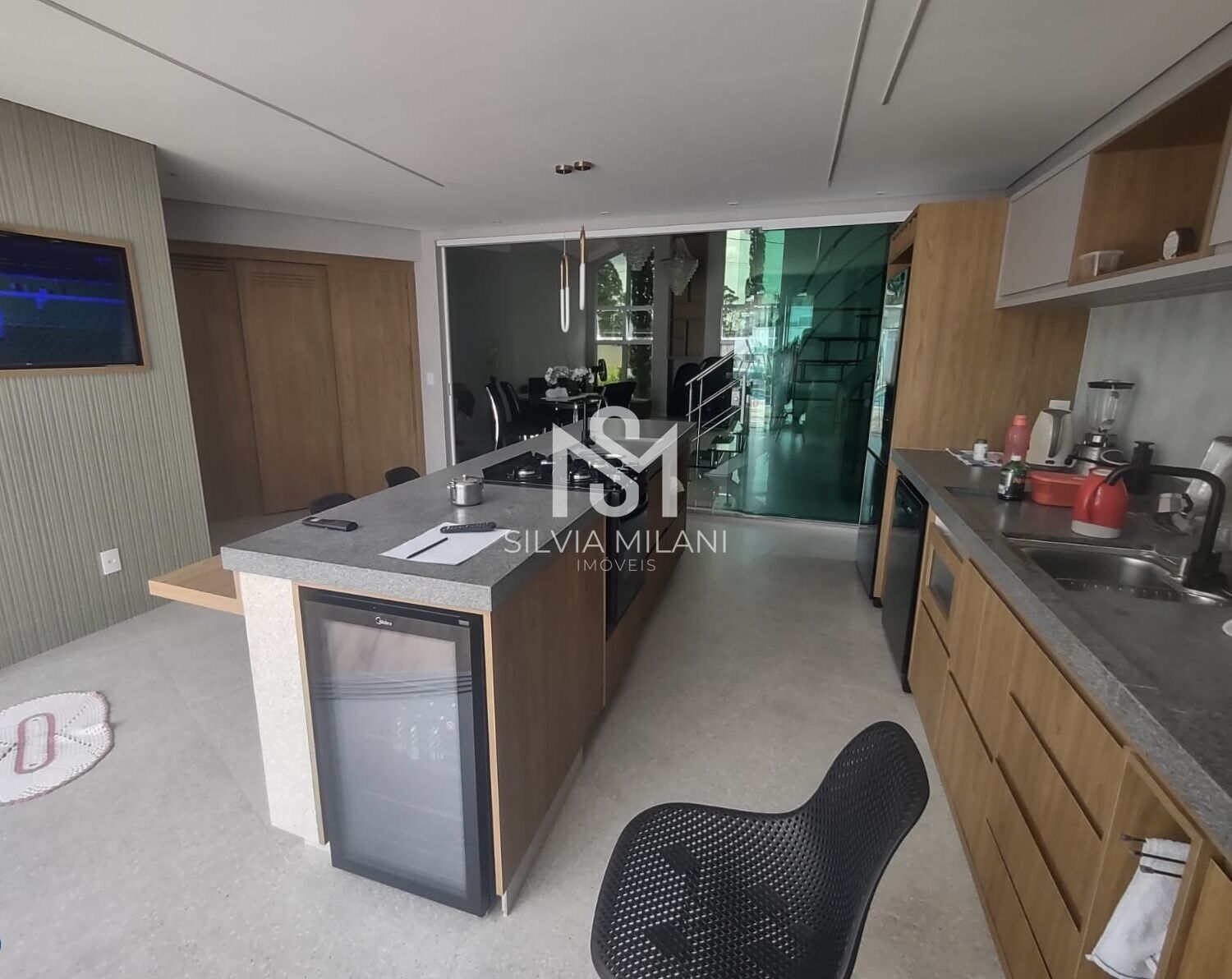 A varanda gourmet é completa com ilha , armários planejados, cooktop, painel de TV e fechamento em vidro